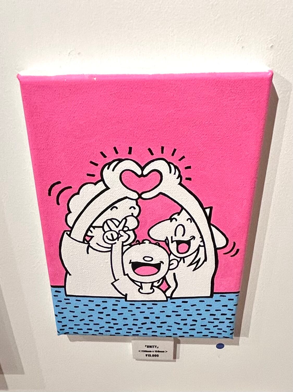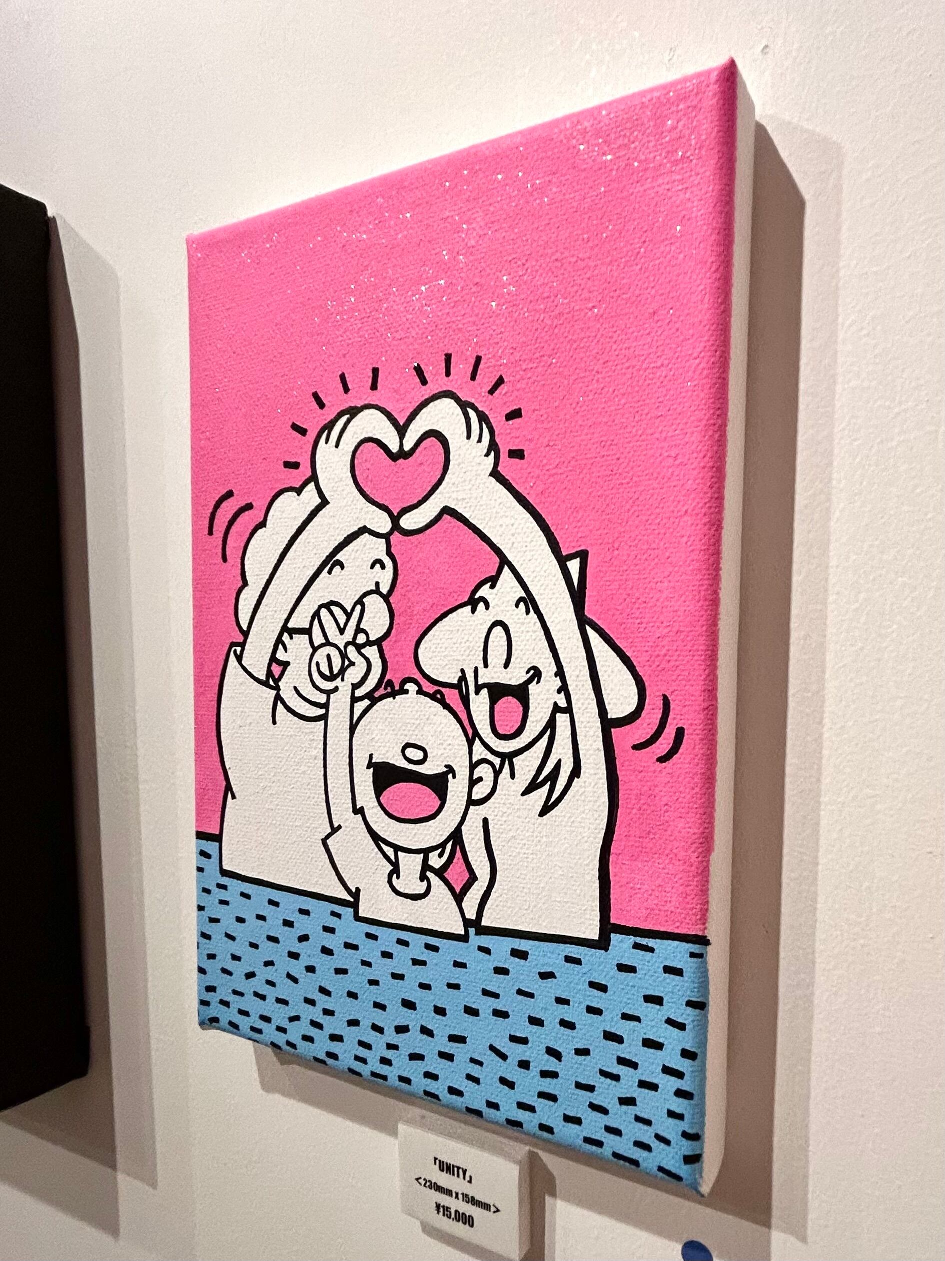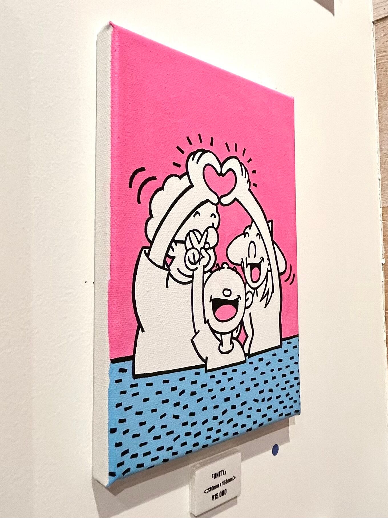 自身の過去作「UNITY」をサンプリングしたKeith Haringのオマージュ作品で本作品展で初めて試みたラメ絵の具を使用しています。