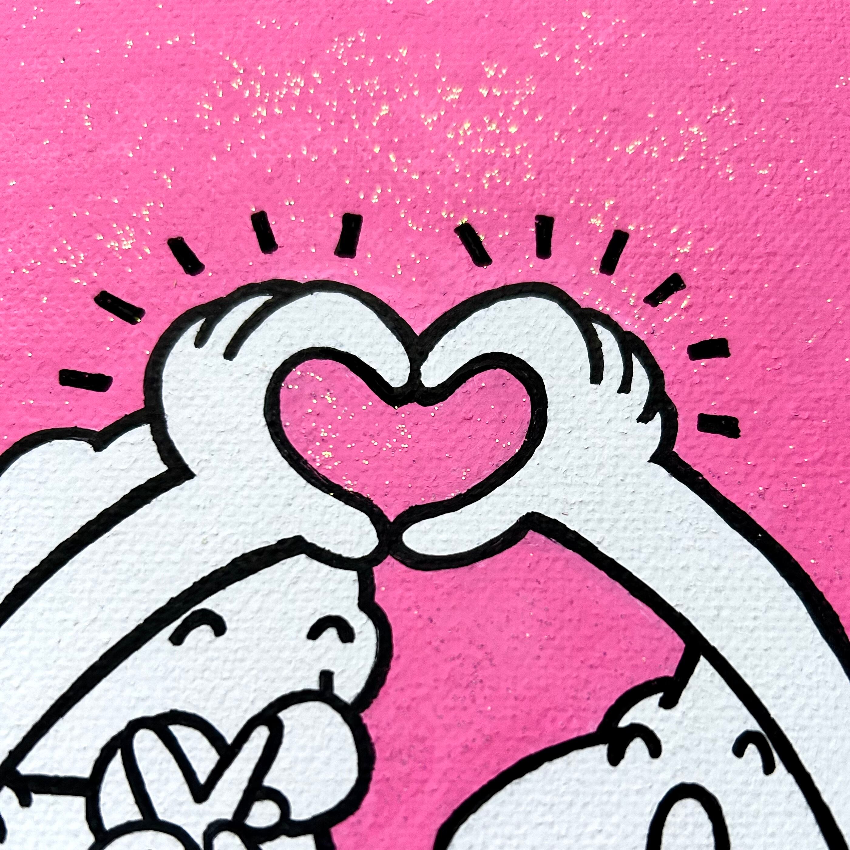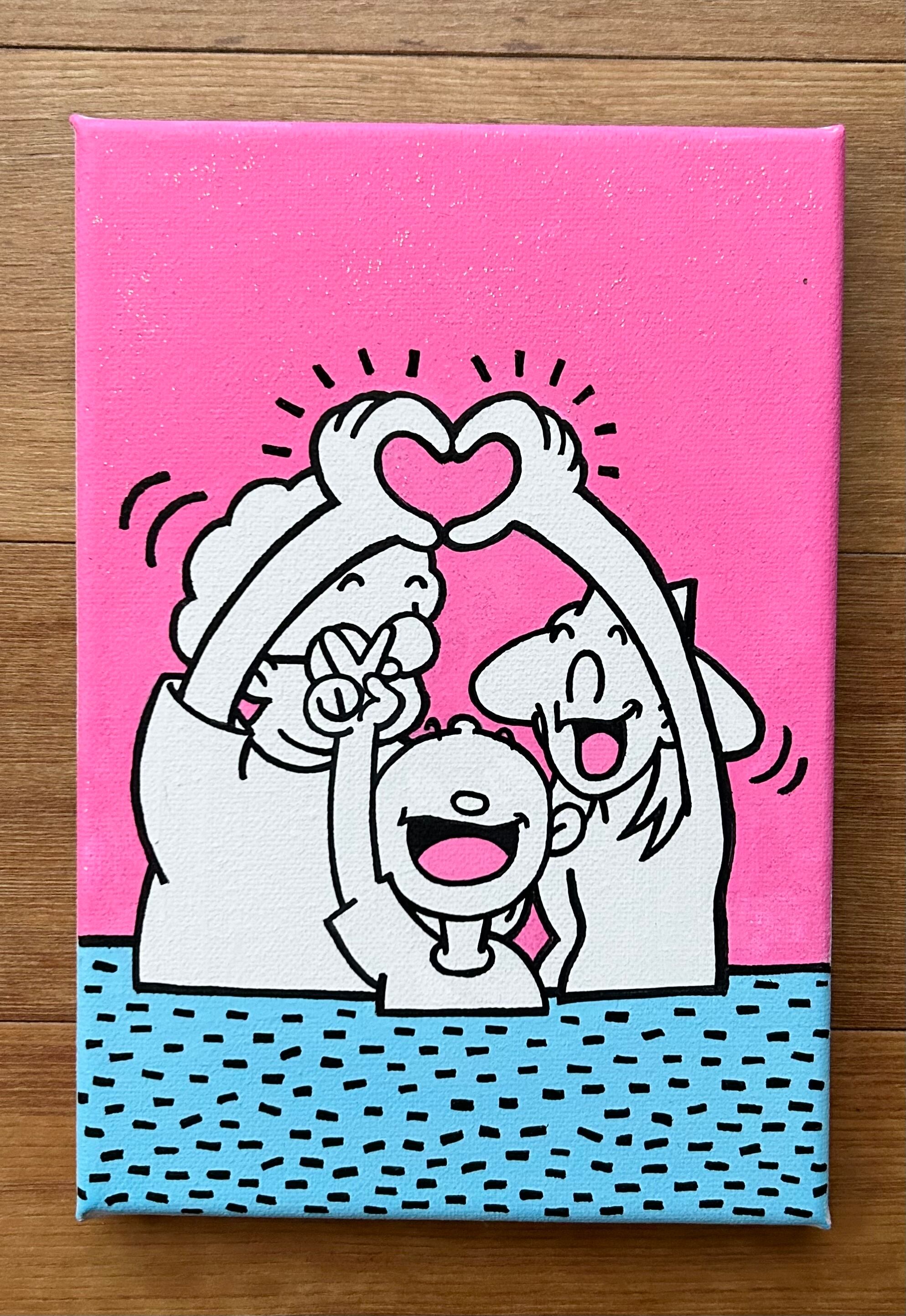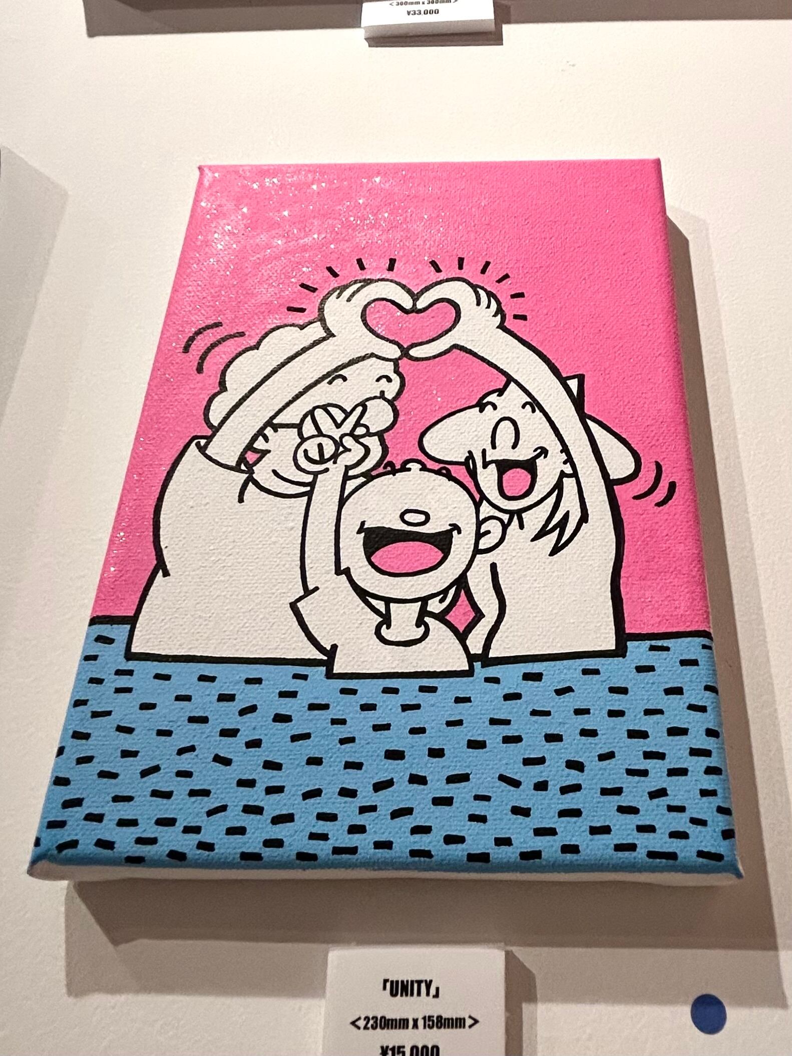自身の過去作「UNITY」をサンプリングしたKeith Haringのオマージュ作品で本作品展で初めて試みたラメ絵の具を使用しています。