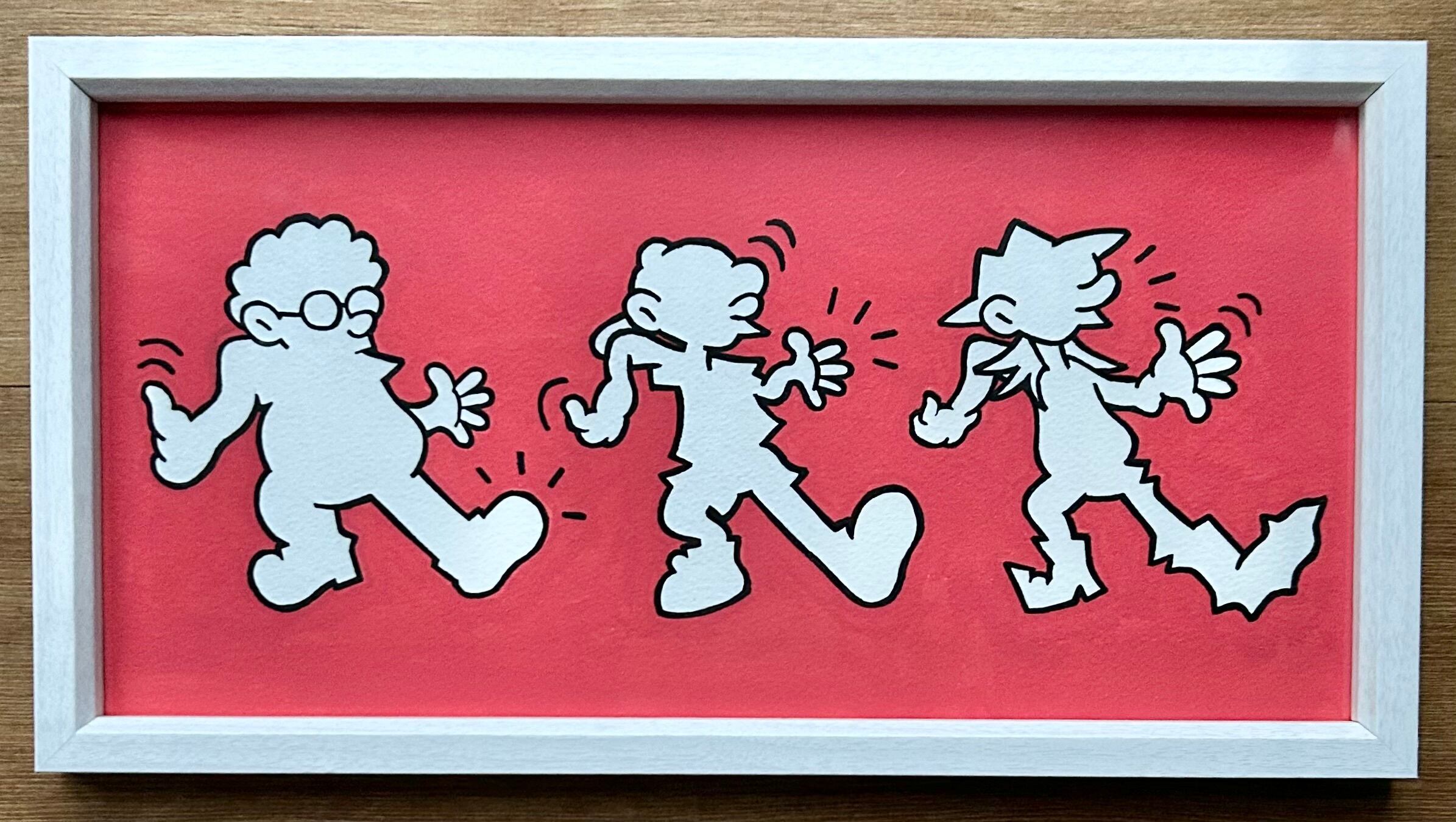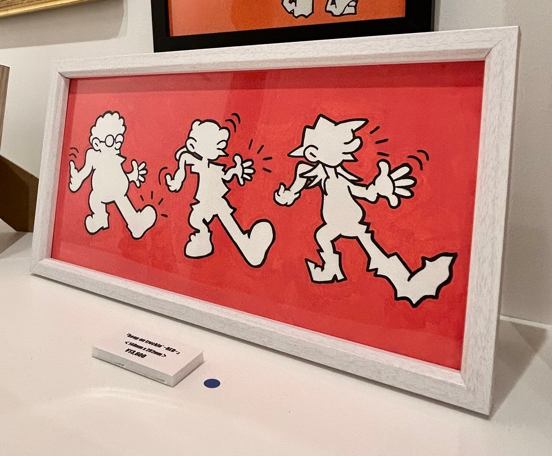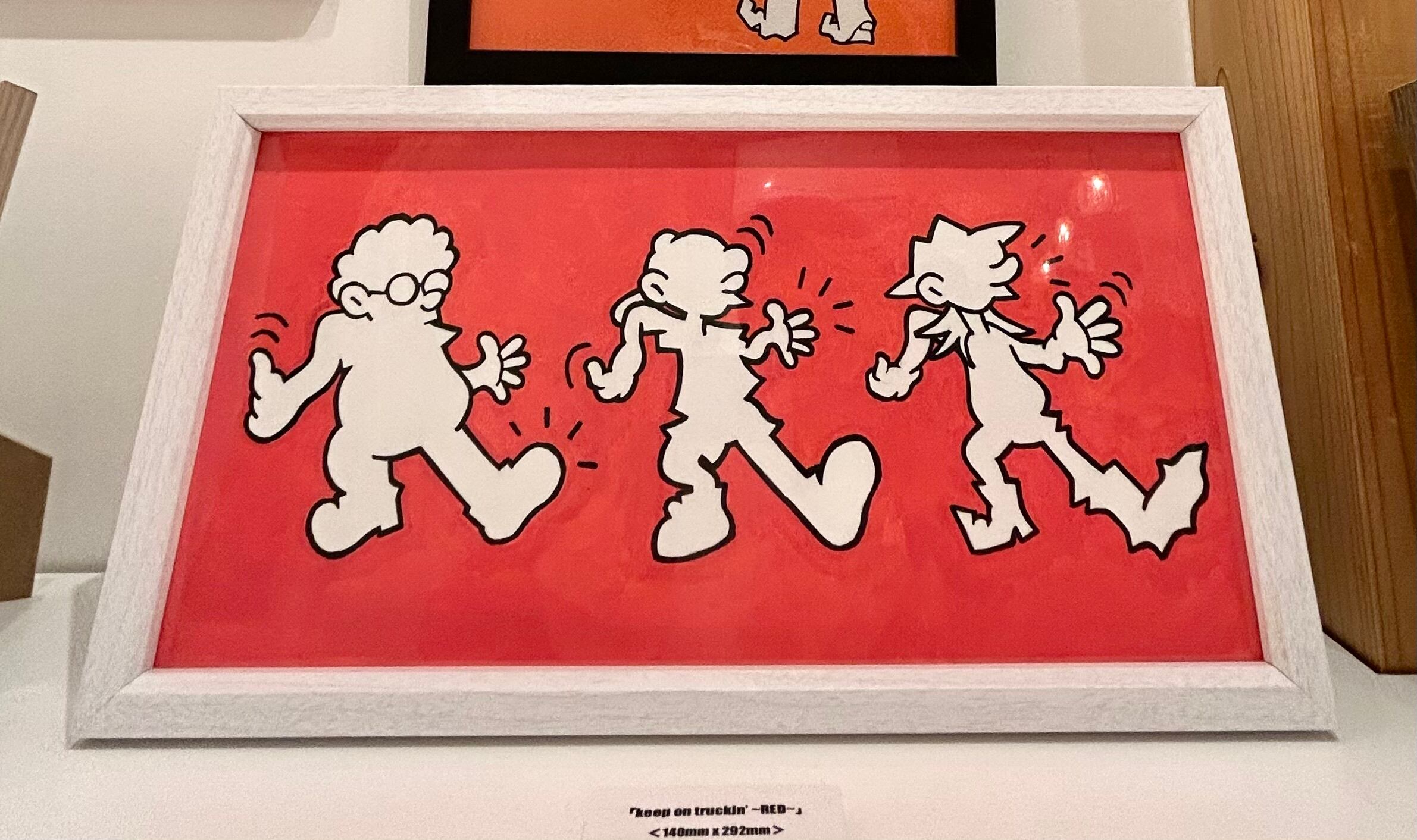 自身のアイコンである3バカキャラクターの「Keep on Truckin'」のセルフサンプリング x Keith Haringのオマージュ作品です。(額装込)