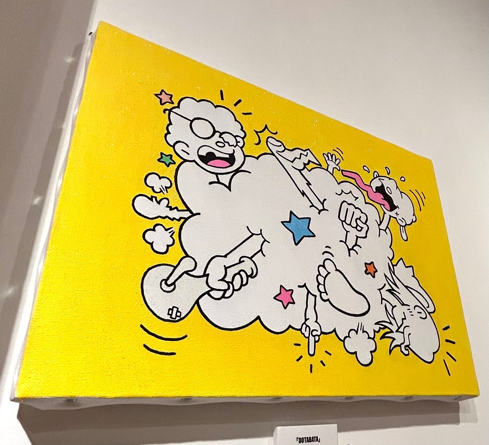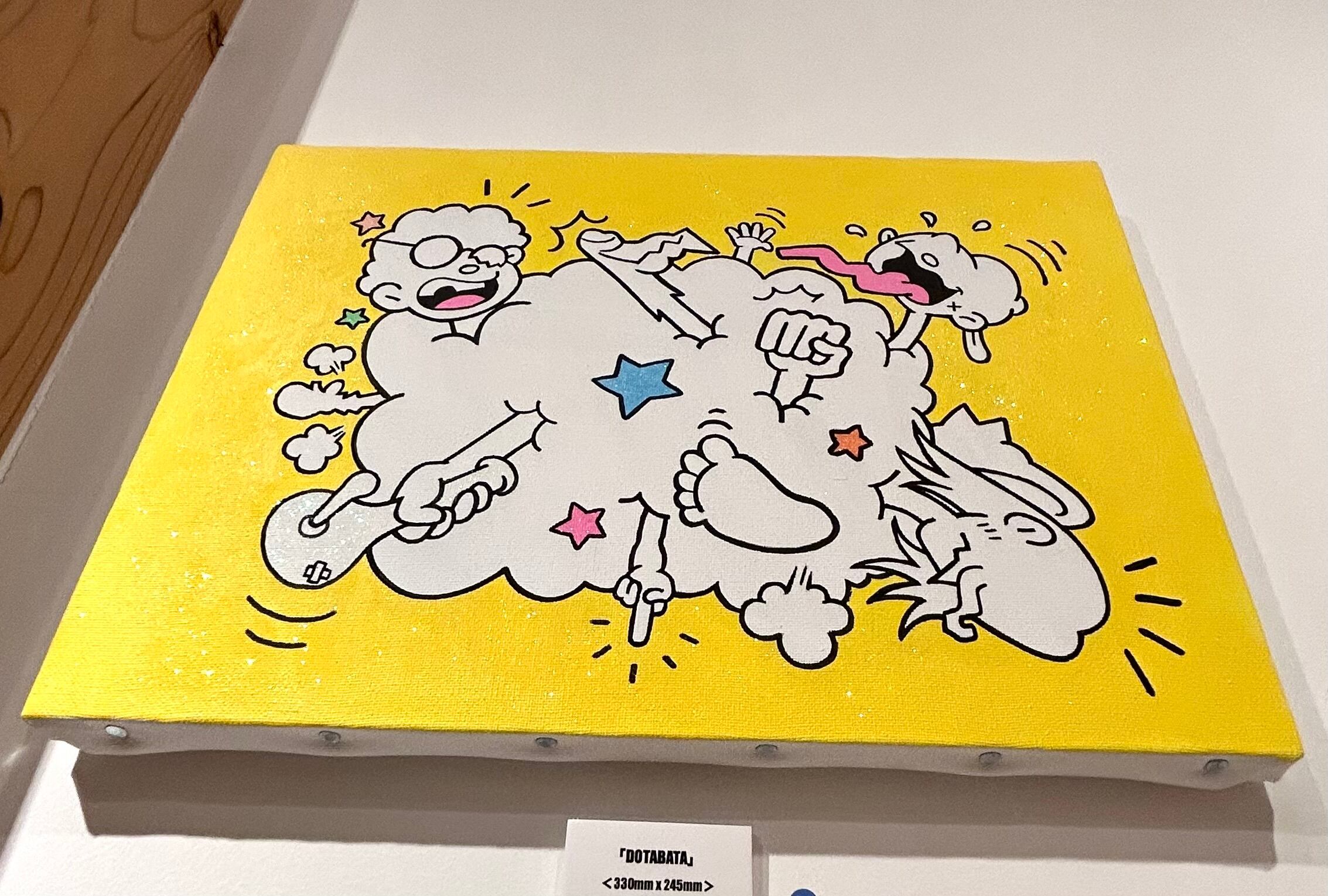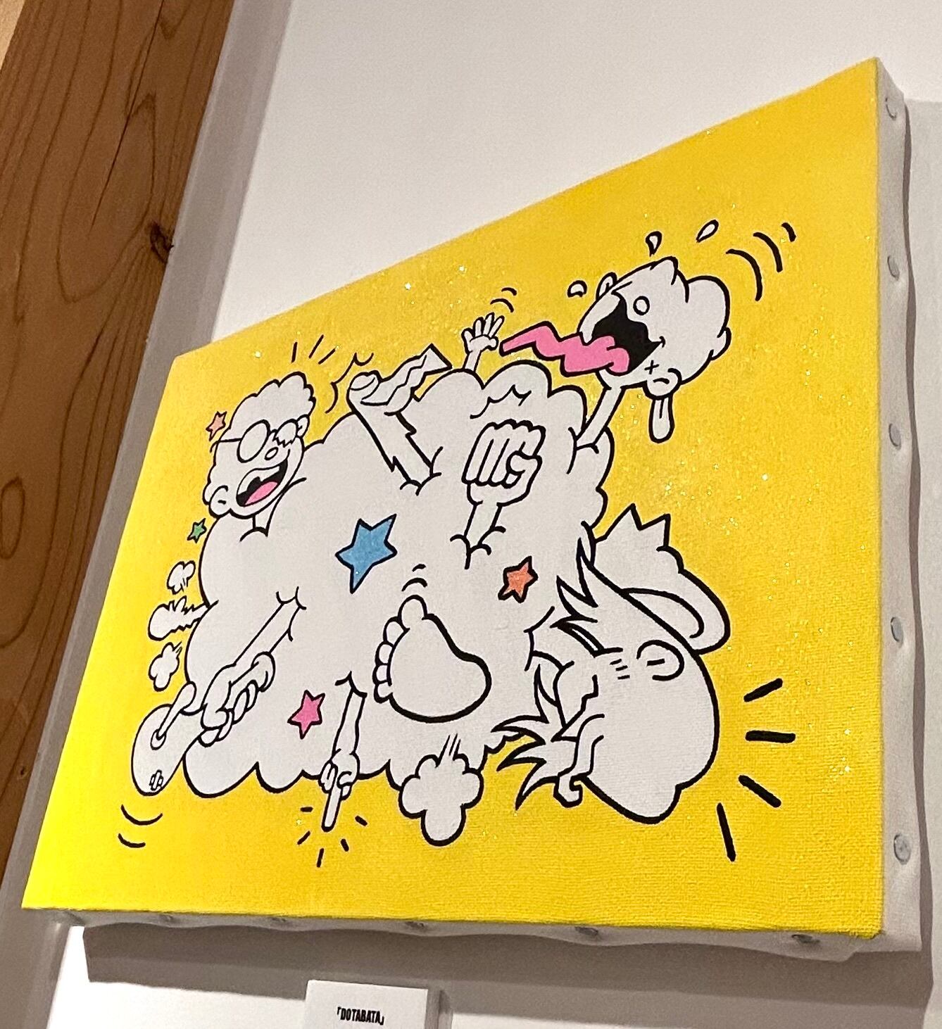 自身の過去作「DOTABATA」をサンプリングしたKeith Haringのオマージュ作品で本作品展で初めて試みたラメ絵の具を使用しています。