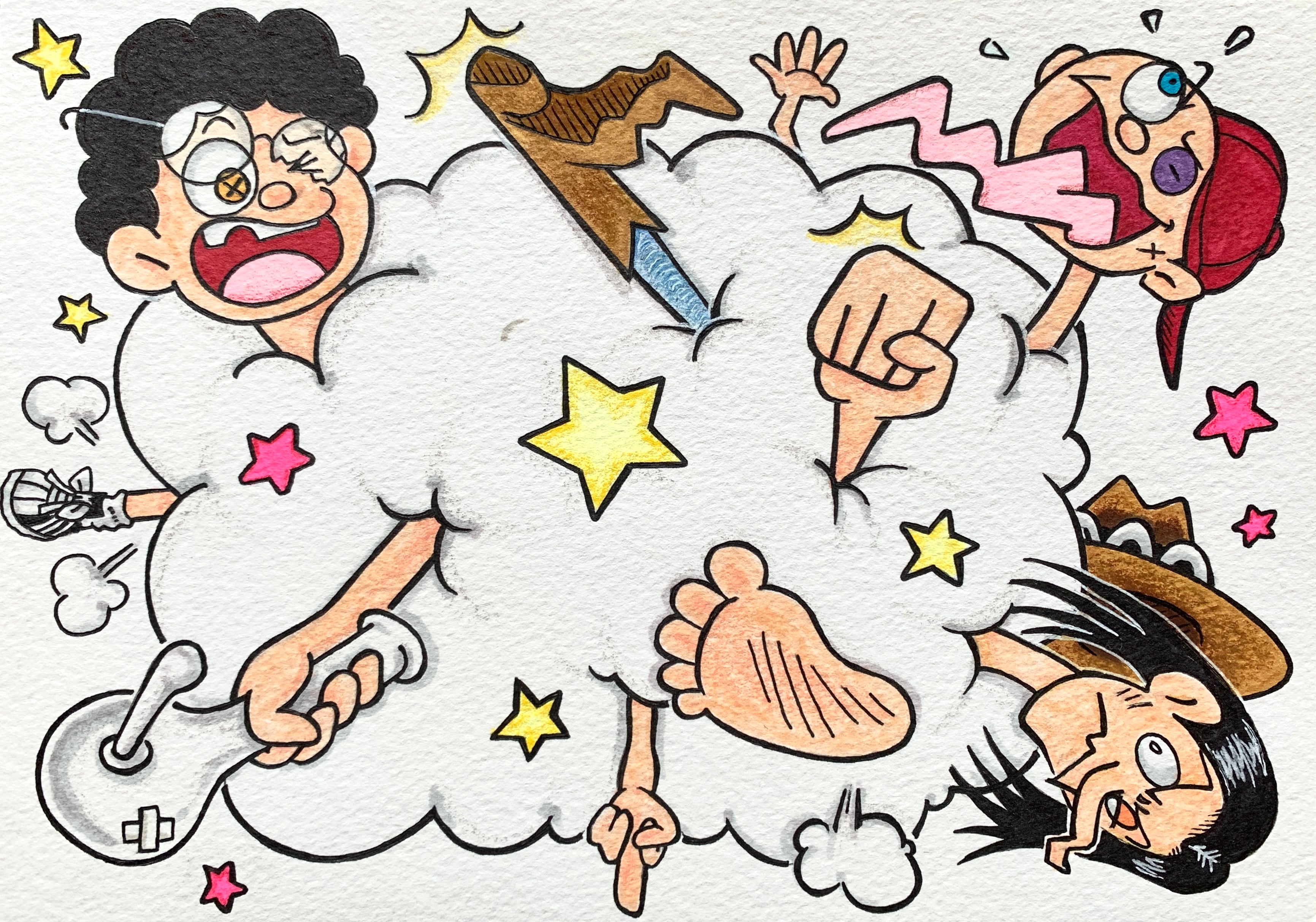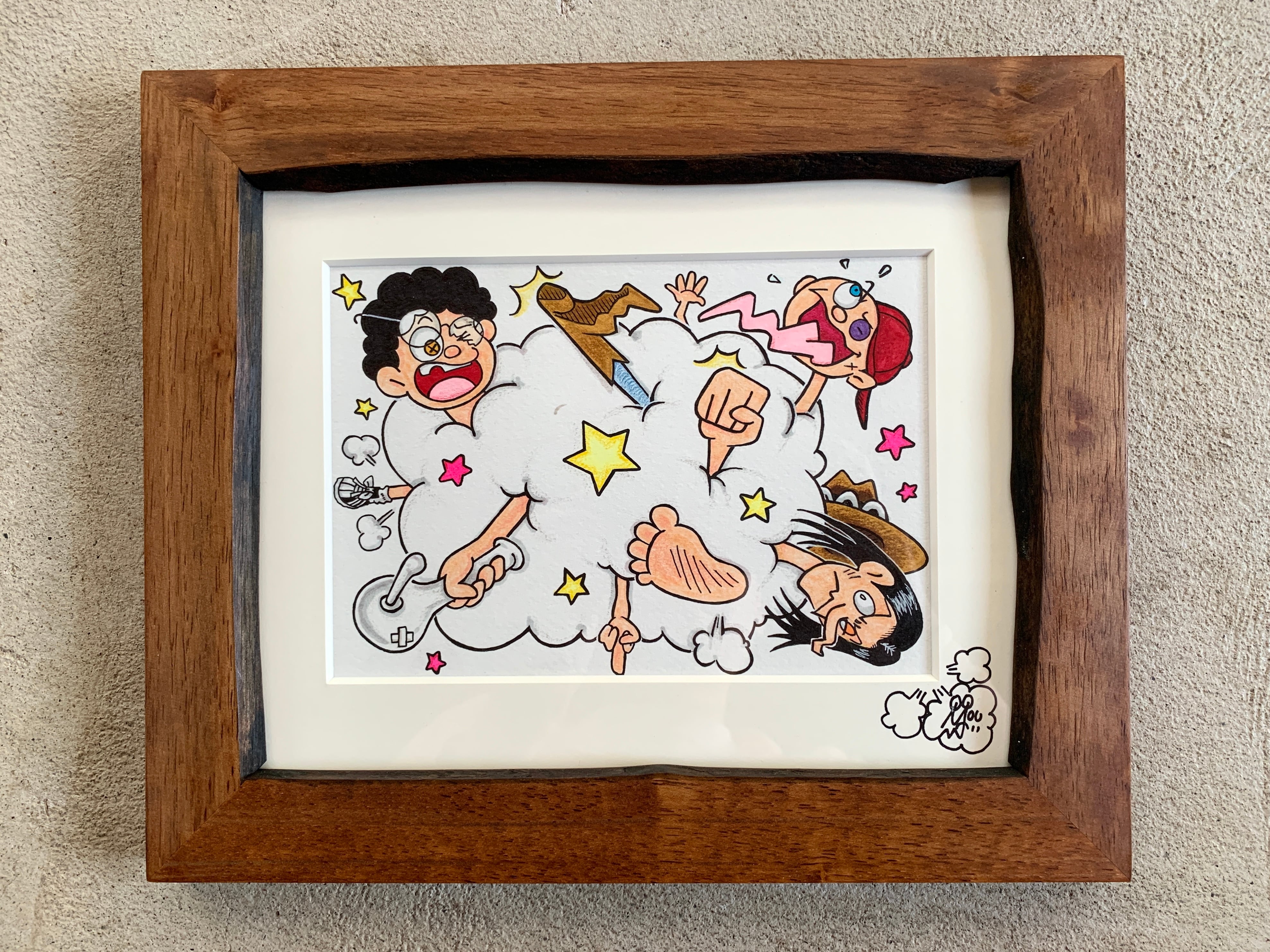 昭和期のケンカを表していたオリジナルはおそらく土煙かと思われますが、僕の作品は お決まりのChillした時のケムリを掛けて表現しており〼
