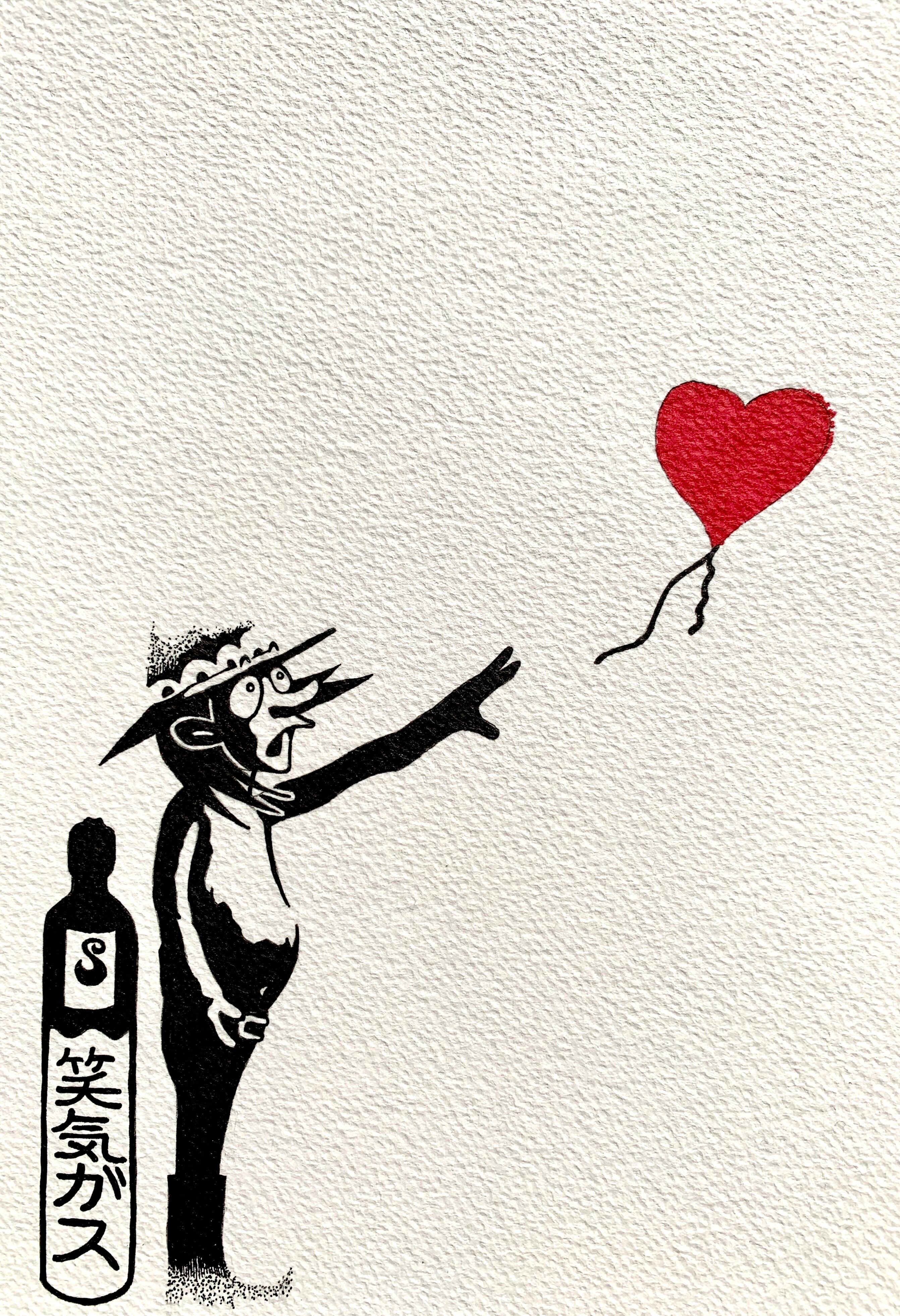 本作は、イギリスの大手オークションハウス「サザビーズ・ロンドン」でのオークション開催中に約1億5千万円での落札直後に、額縁に内蔵したシュレッダーが作動して作品がカットされた事でBANKSYを知らなかった一般層にまで、その名が知れ渡るきっかけとなった作品「Girl with Balloon」をモチーフに描きあげました。