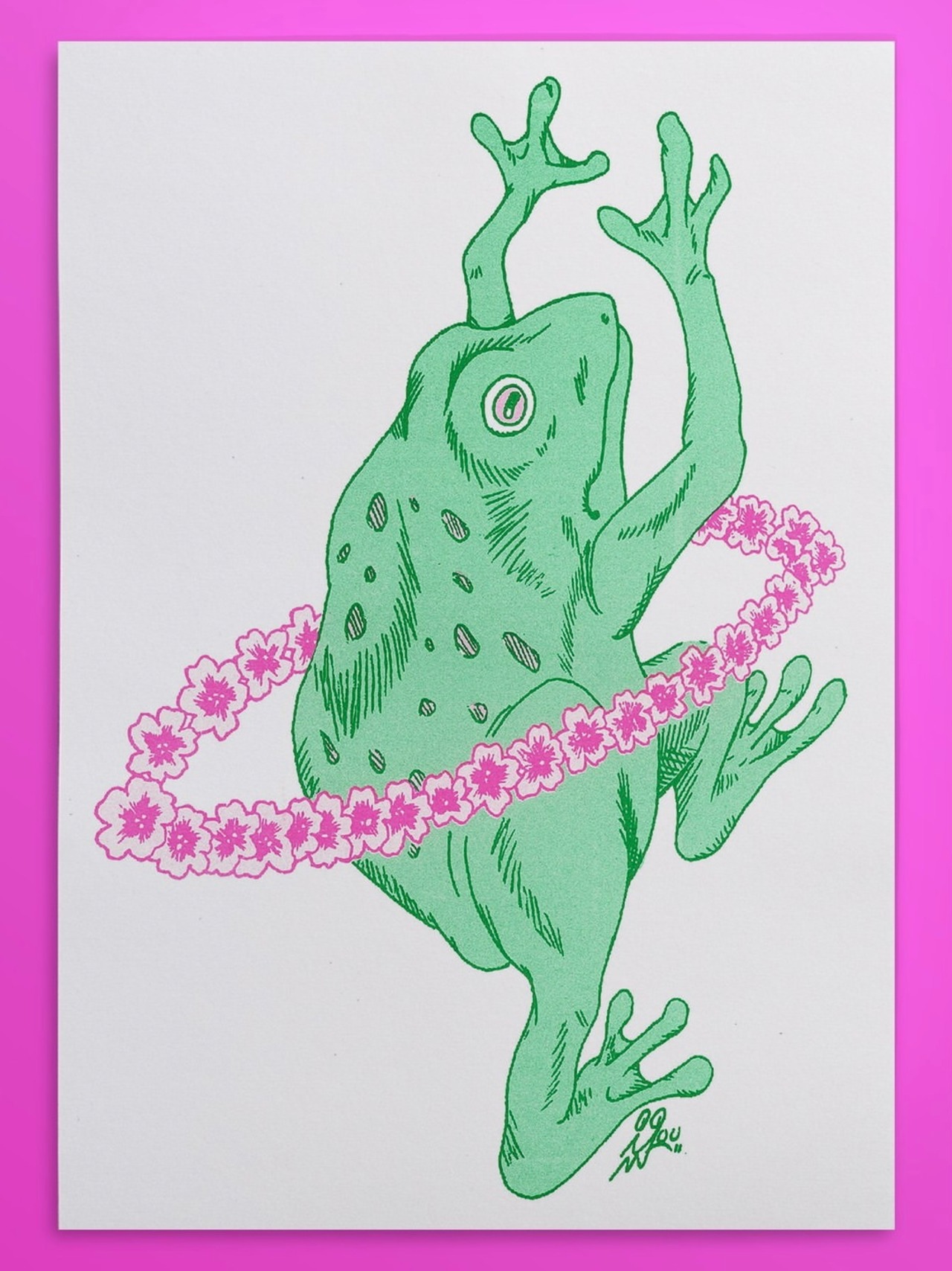 ポスターサイズはA4で、プリント技法は上質紙にリソグラフ印刷(緑 x ピンクの2色使い)を採用しています。