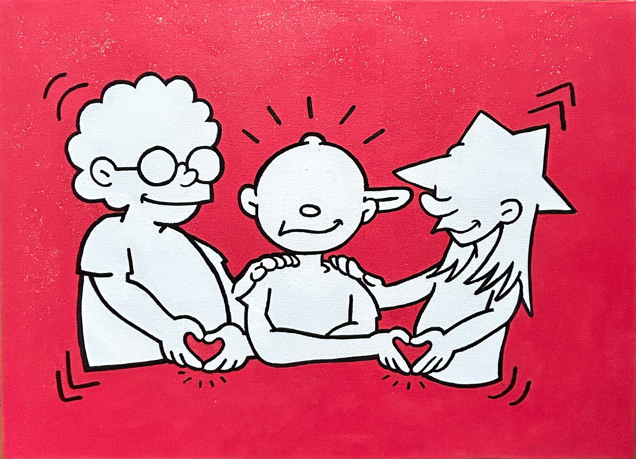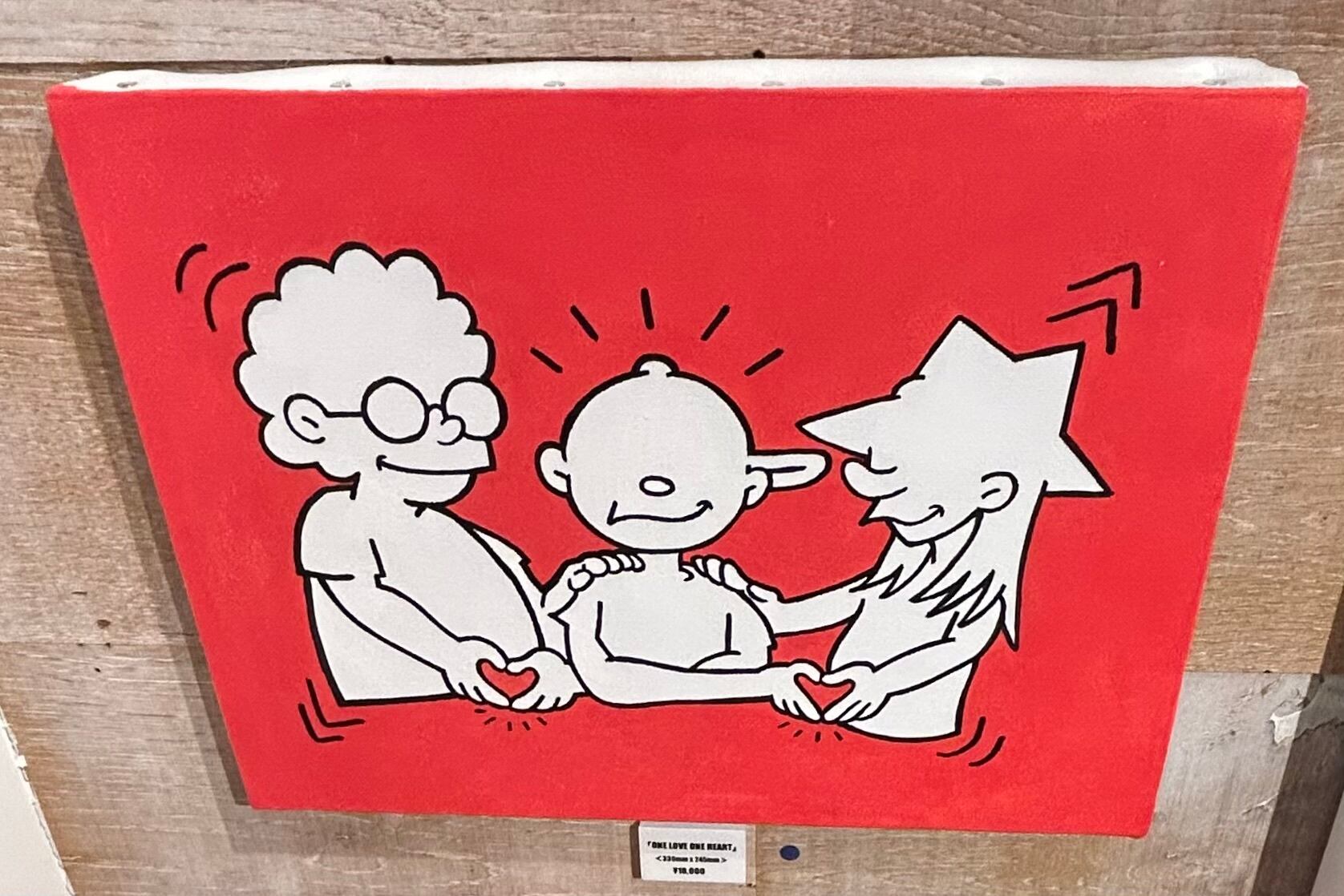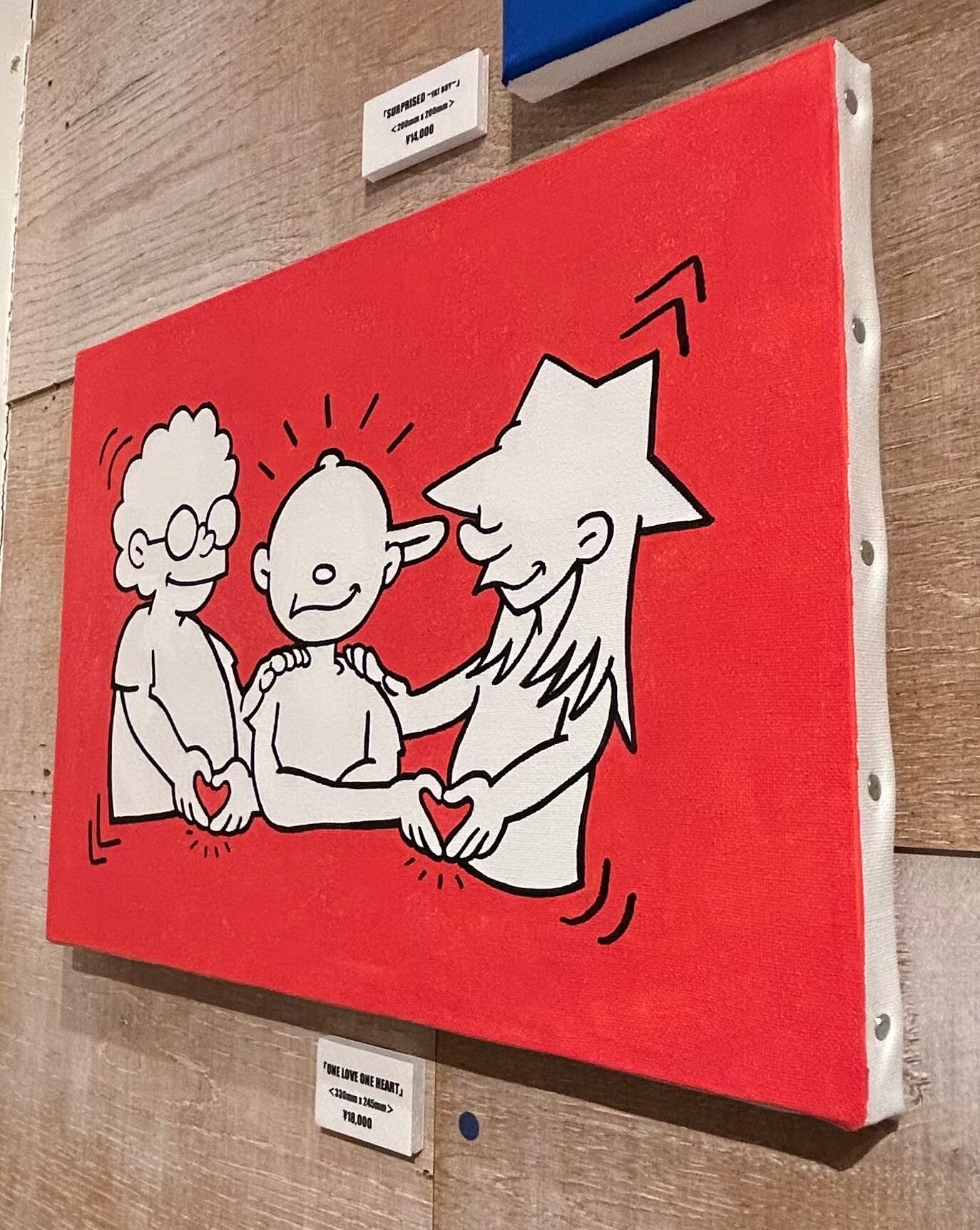 自身の過去作「ONE LOVE ONE HEART」をサンプリングしたKeith Haringのオマージュ作品で本作品展で初めて試みたラメ絵の具を使用しています。
