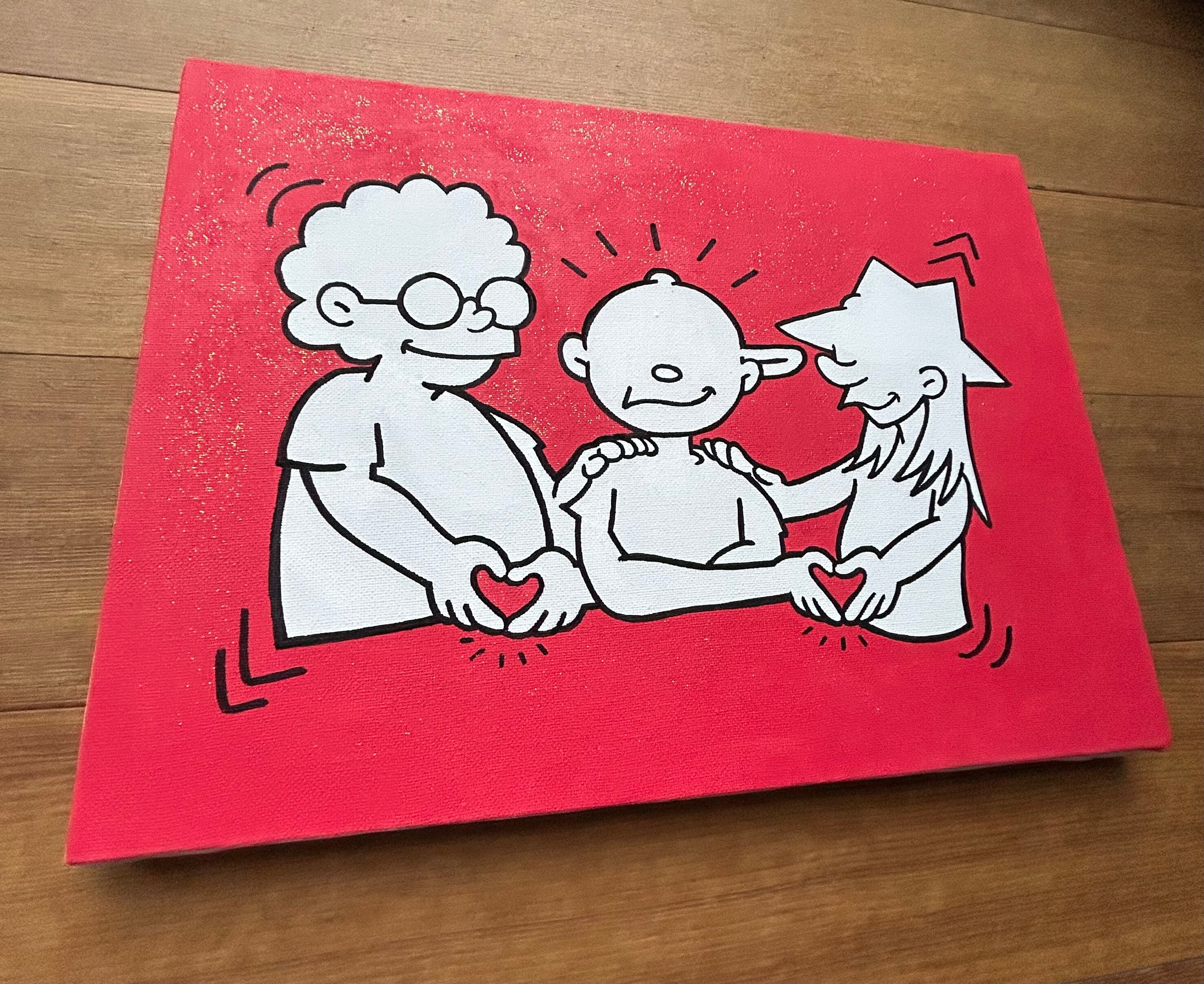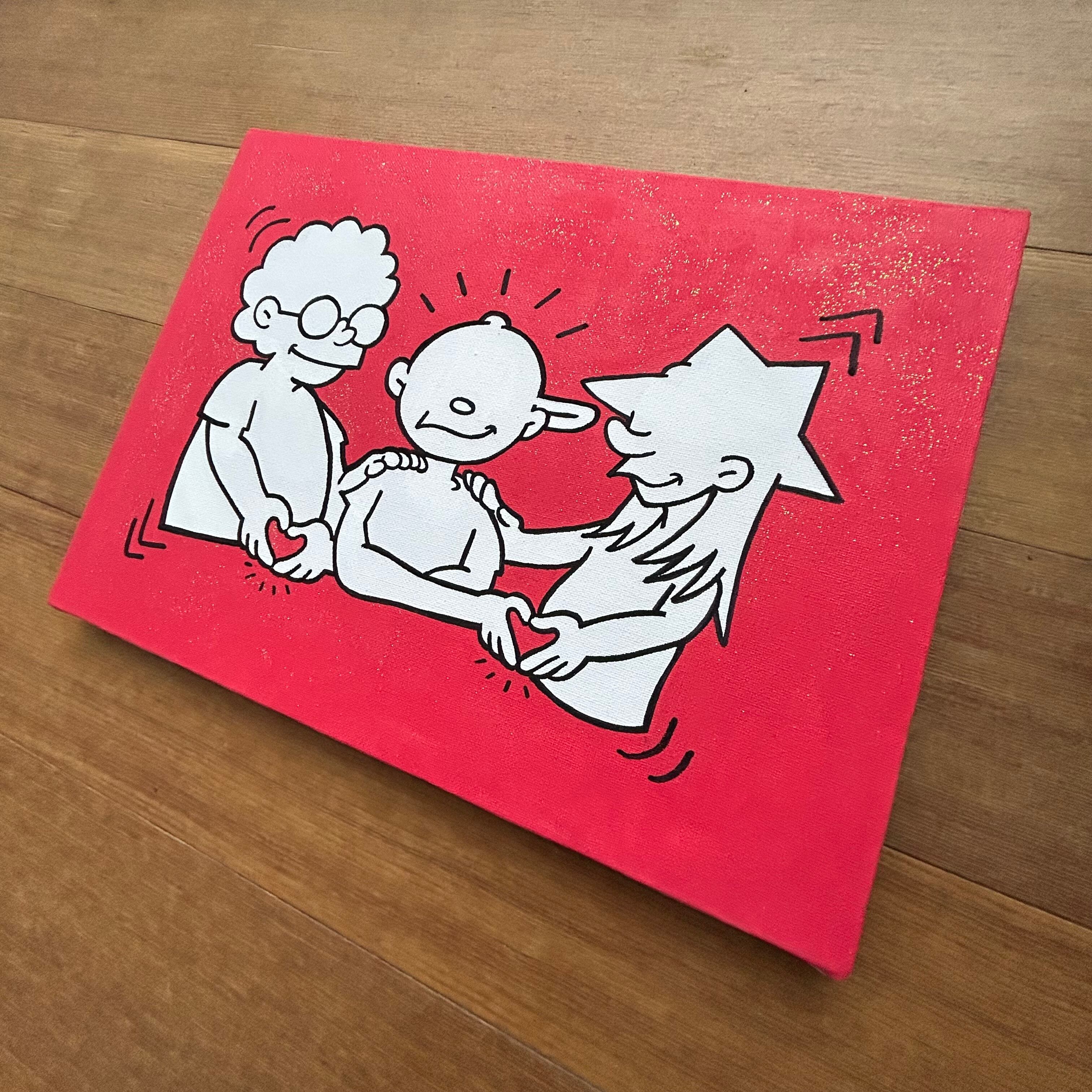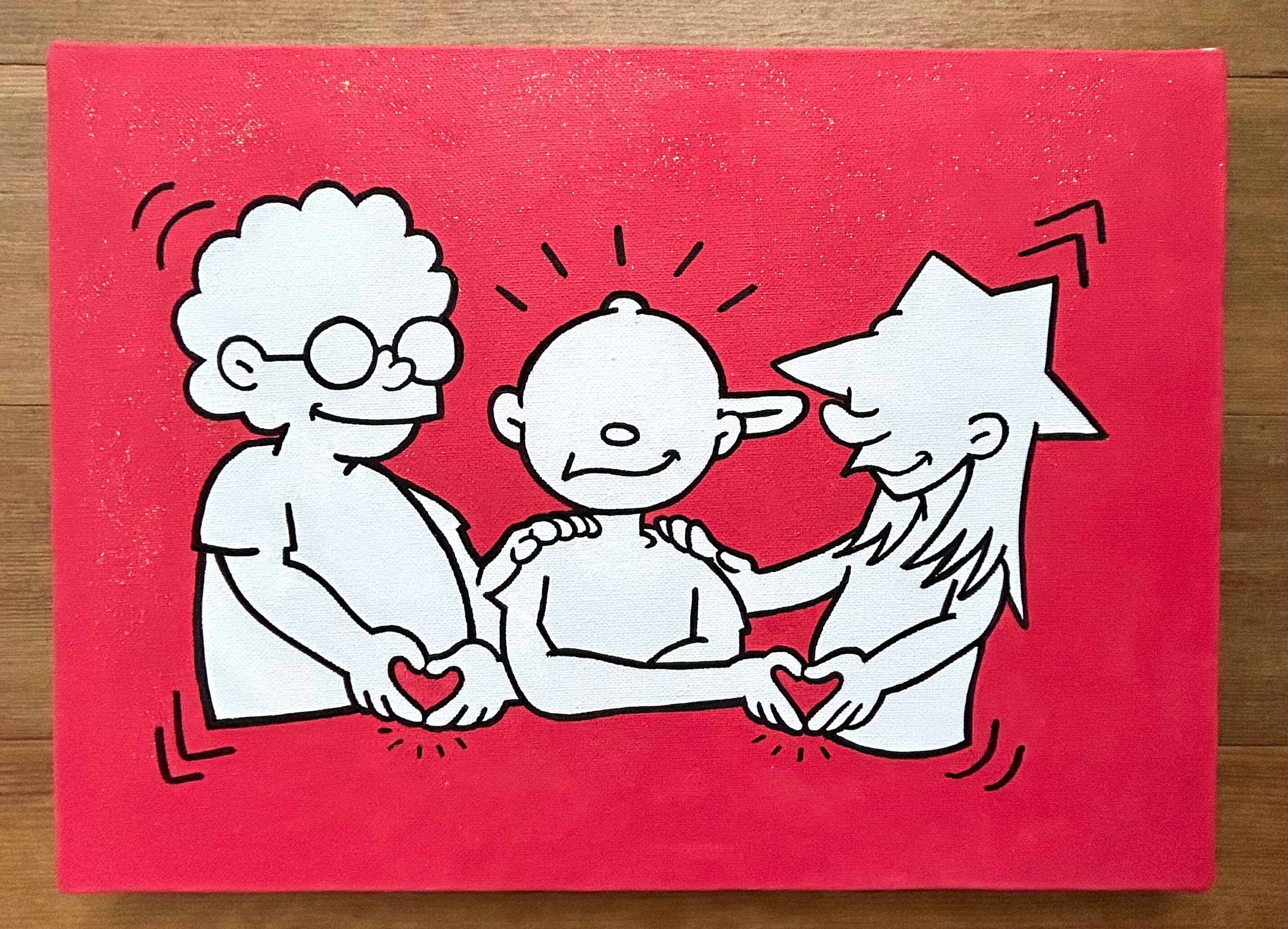 自身の過去作「ONE LOVE ONE HEART」をサンプリングしたKeith Haringのオマージュ作品で本作品展で初めて試みたラメ絵の具を使用しています。